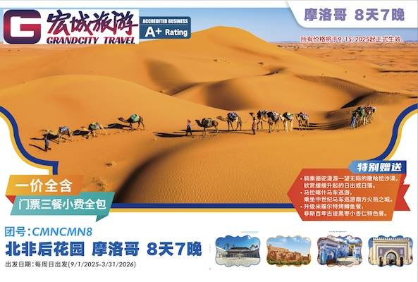 ZH/CMNCMN8 北非后花园丨摩洛哥 卡萨布兰卡+马拉喀什+瓦尔扎扎特+撒哈拉沙漠+非斯+舍夫沙万 8天7晚游