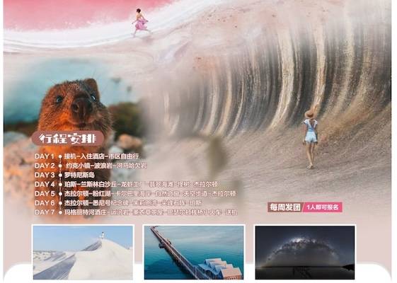 备注:以上为参团客人周日抵达珀斯的参考行程,如果参团客人抵达珀斯的时间为周六,则行程顺序有所调整,第7天罗特尼斯岛调整到第2天,原第2天-第6天行程顺序往后递延一天。行程时间和顺序仅供参考,请以当天实际情况为准。